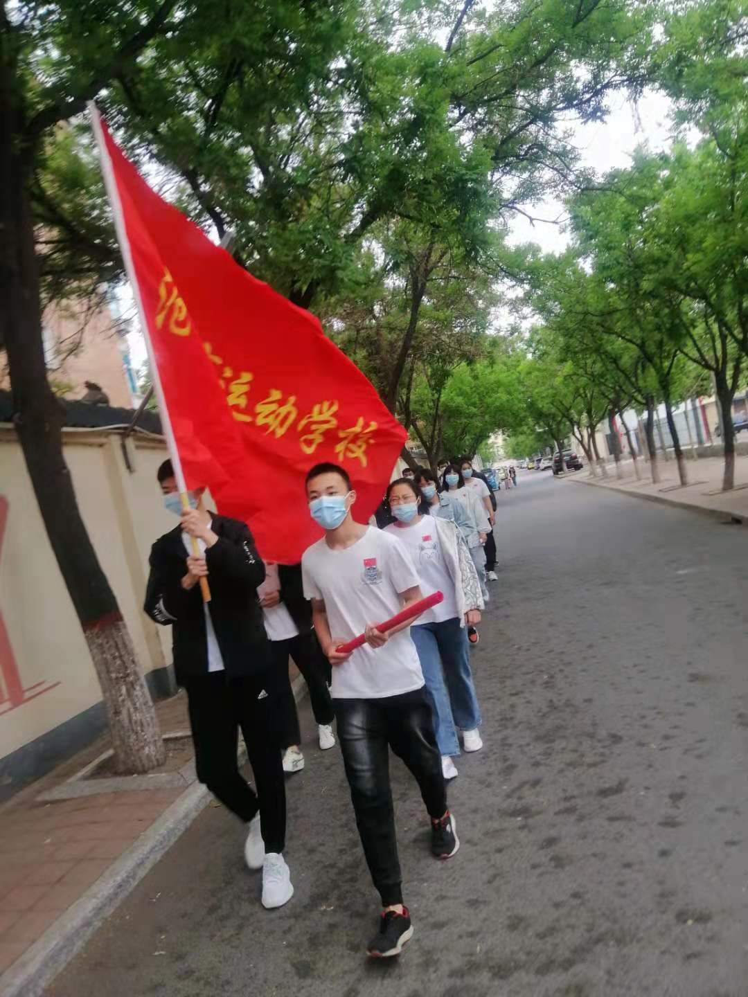 学校优秀学生代表正行进在前往胜利公园瞻仰烈士纪念碑的路上
