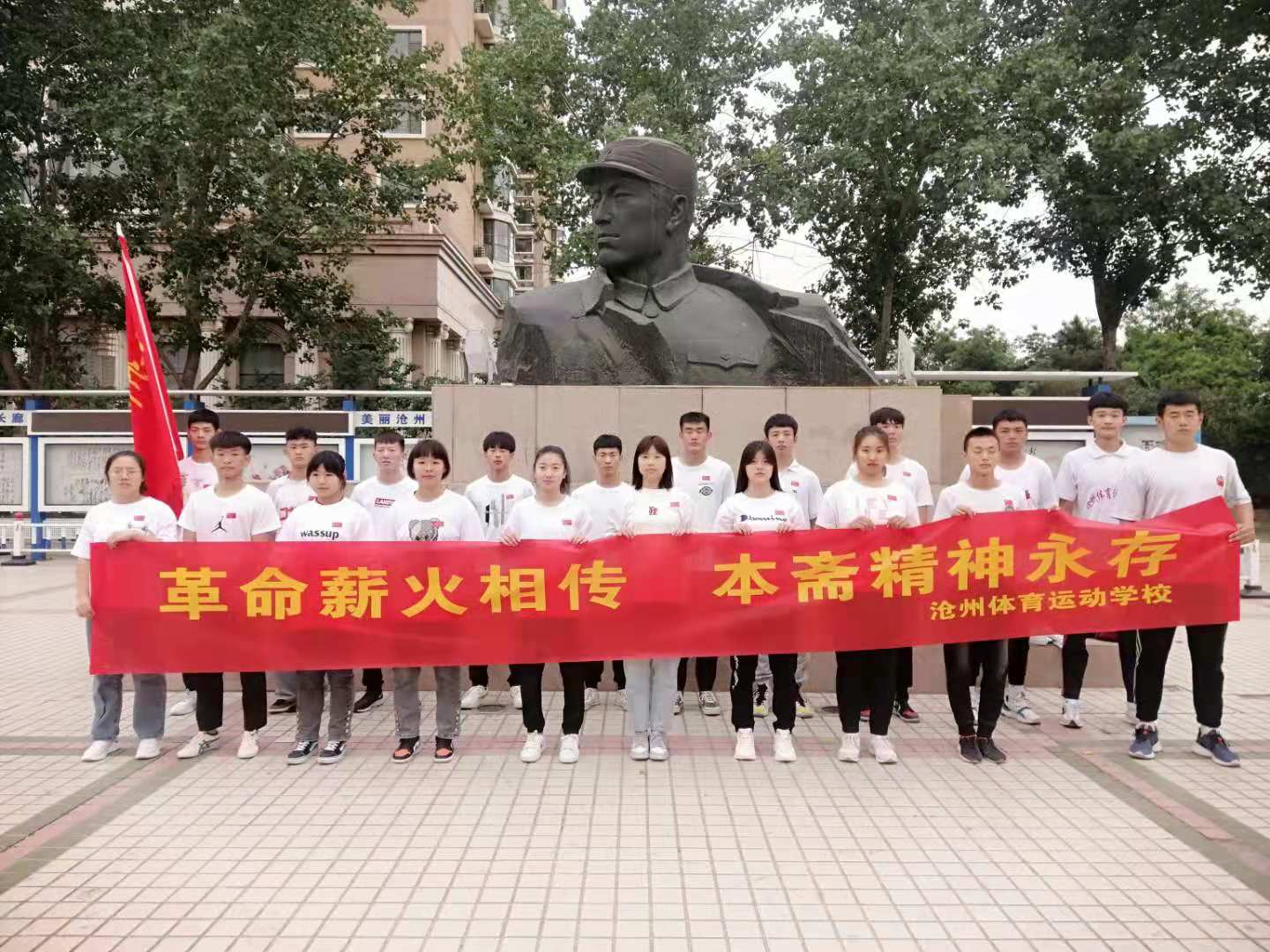学生在马本斋塑像前留念,红色信仰根植每个孩子的心中